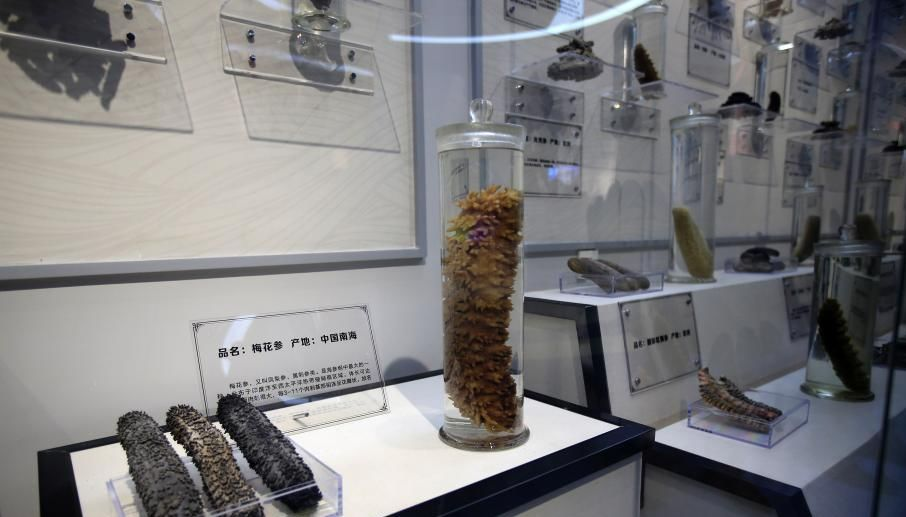 館內(nèi)收集了全球上百種海參標(biāo)本及簡介,可供參觀者辨別、學(xué)習(xí)。其中最珍貴的要數(shù)2013年蛟龍?zhí)枏乃?/span>4994米打撈上來的深海海參標(biāo)本;還可通過互動(dòng)球幕裝置,點(diǎn)擊查詢世界上主要的海參生活區(qū)域等。