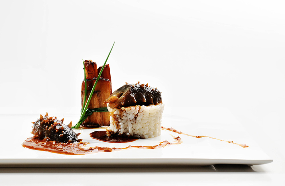 2、水發(fā)刺參對(duì)半切開(kāi),汆水,放到米飯上待用;